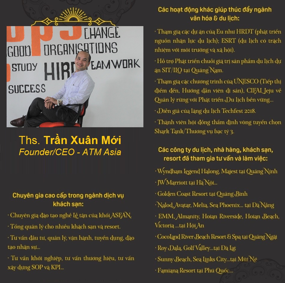 Buổi đào tạo định hướng nghề Du lịch Miễn phí do ATM tổ chức. Ths Trần Xuân Mới – Founder/CEO của Công ty Tư Vấn & Quản Lý, chuyên gia của ngành du lịch Việt nam sẽ trực tiếp trò chuyện và chia sẻ với học sinh/sinh viên, các bậc phụ huynh và những người đang làm nghề Du lịch. Dẫn chương trình MC Nguyễn Xuân Vinh – Giám đốc Phát triển nguồn Nhân lực – ATM.